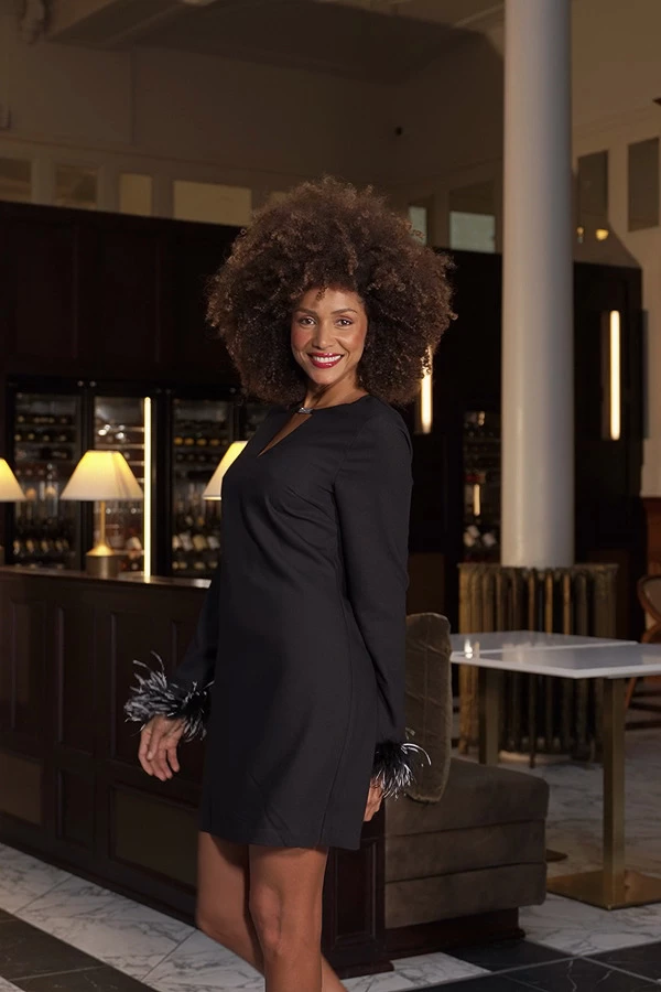 - Product composition: 75% Polyester 18% Viscose 7% Elastane | Lining: 100% Polyester | Trim: 100% Feathers