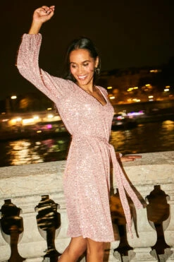 Rose Gold Sequin V Neck Belted Shift Dress