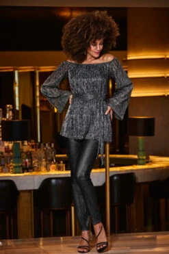 Pewter Metallic Plisse Bardot Belted Jersey Top