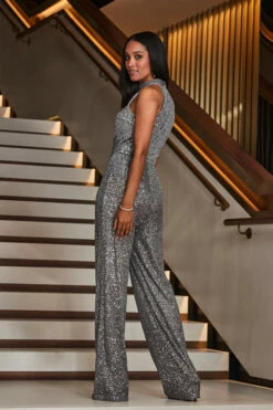Silver Sequin Halter Neck Wide Leg Jumpsuit